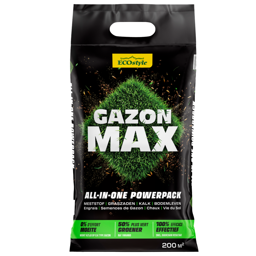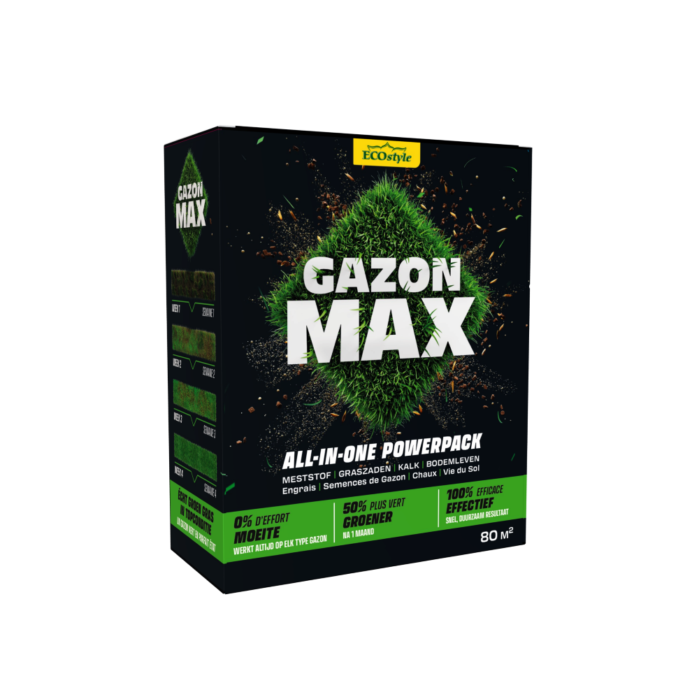 0 % Aufwand, 50 % grüneres Gras und 100 % Wirksamkeit! GazonMax ist das All-in-One-Powerpaket, um beschädigte Rasenflächen im Handumdrehen zu reparieren. Das Produkt besteht aus einer Mischung aus biologischen Grassamen, organischen Düngemitteln, Wasserkalk und nachhaltigen Bodenverbesserern. Es wirkt auf allen Rasentypen und kann auch zur Anlage eines neuen Rasens verwendet werden. GazonMax ist 100 % natürlich und sicher für Kinder und Haustiere. Dieses Komplettpaket sorgt innerhalb eines Monats für lebendig grünes Gras. GazonMax versorgt Ihren Rasen drei Monate lang mit Nährstoffen und schützt ihn gleichzeitig vor Moosbildung und Unkraut. Das Endergebnis? Ein starker Rasen mit vollerem und grünerem Gras!