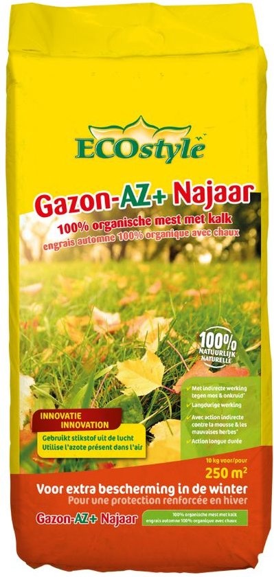 Gazon-AZ Najaar geeft een sterk wintergazon en een gezond gazon in het voorjaar. Gazon-AZ Najaar bevat kalium en kalk voor extra bescherming in de winter, hierdoor is het gazon beter bestand tegen de vorst. Deze 100% organische meststof is een 2 in 1 oplossing. Het extra kalium verhoogt de weerstand van het gazon en de toevoeging van kalk zorgt voor het verhogen van de zuurgraad van de bodem. Mos en onkruid krijgen hierdoor nauwelijks kans. Gazon-AZ Najaar is dé basis voor een gezond gazon in het voorjaar.
